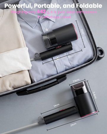 Le sèche-cheveux dispose d’une poignée pliable. Une fois plié, il mesure moins de 20 cm, ce qui le rend facile à glisser dans une valise ou un sac à main.